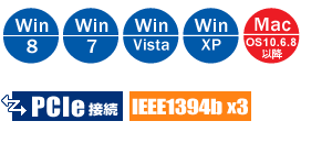 スペック表 型番 CIF-FW8P3 インターフェース IEEE1394b 3ポート インターフェイス形状 IEEE1394b 9ピン バスインターフェイス PCI Express 1レーン 転送レート 800Mbps(理論値) コントローラIC Texas Instruments XIO2213BZAY 寸法 高さ68mm×奥行き70mm(ブラケット除く) 温度・湿度 3,280g (ドライブ含まず) 温度、湿度 温度5〜35度 湿度20〜80%(結露無き事、接続するPCの動作範囲内である事) 対応機種 【Windows】 PCI Express x1〜x16スロットを搭載したPC/AT互換機 ※intelチップセット搭載モデル推奨。
